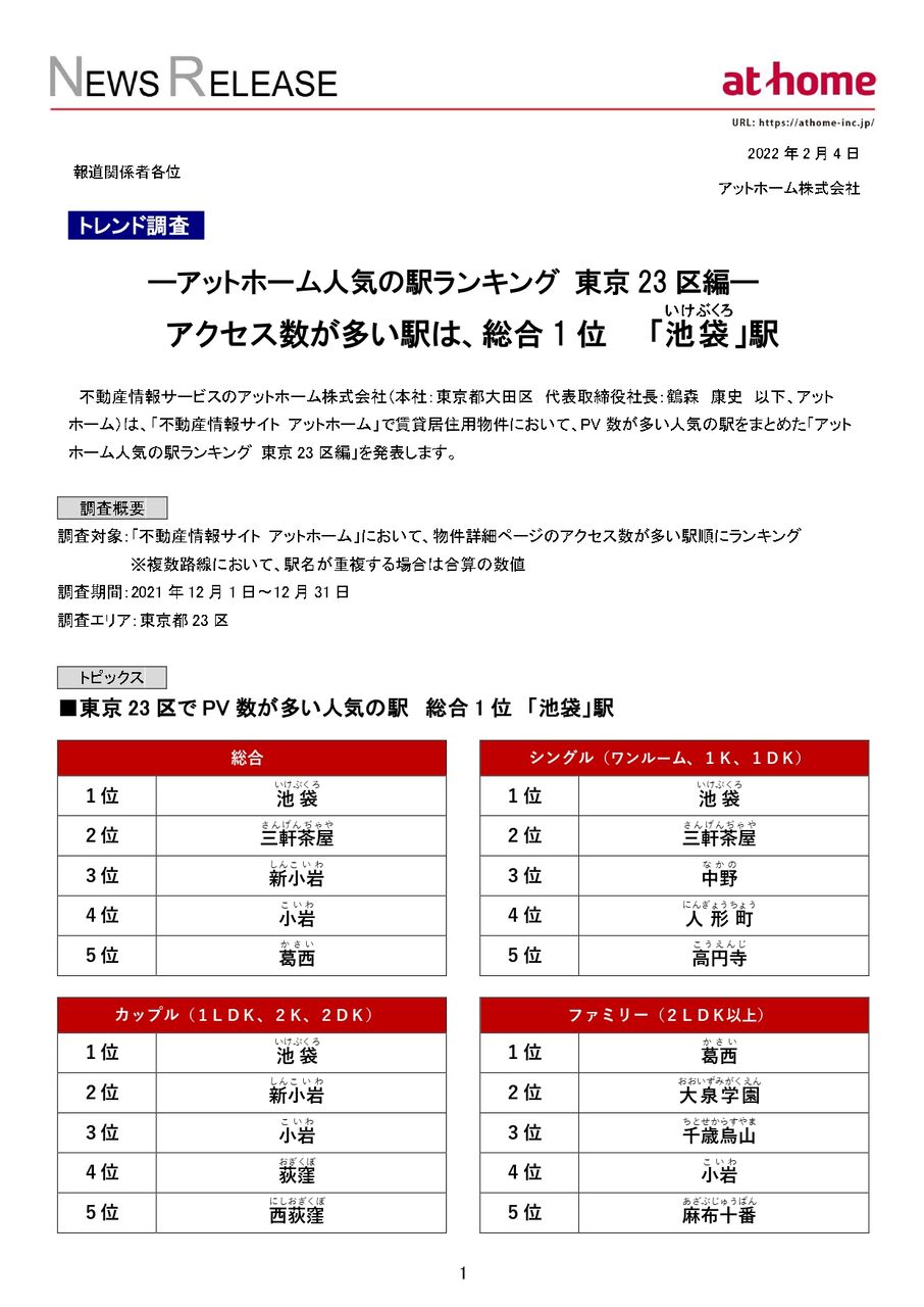※『アットホーム人気の駅ランキング 東京23区編』の詳細は、こちら。