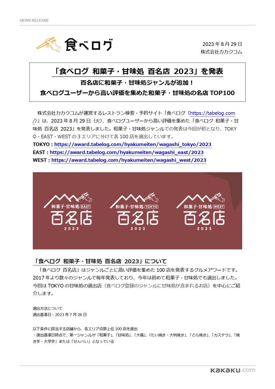 ※『食べログ 和菓子・甘味処 TOKYO 百名店 2023』については、こちら。
